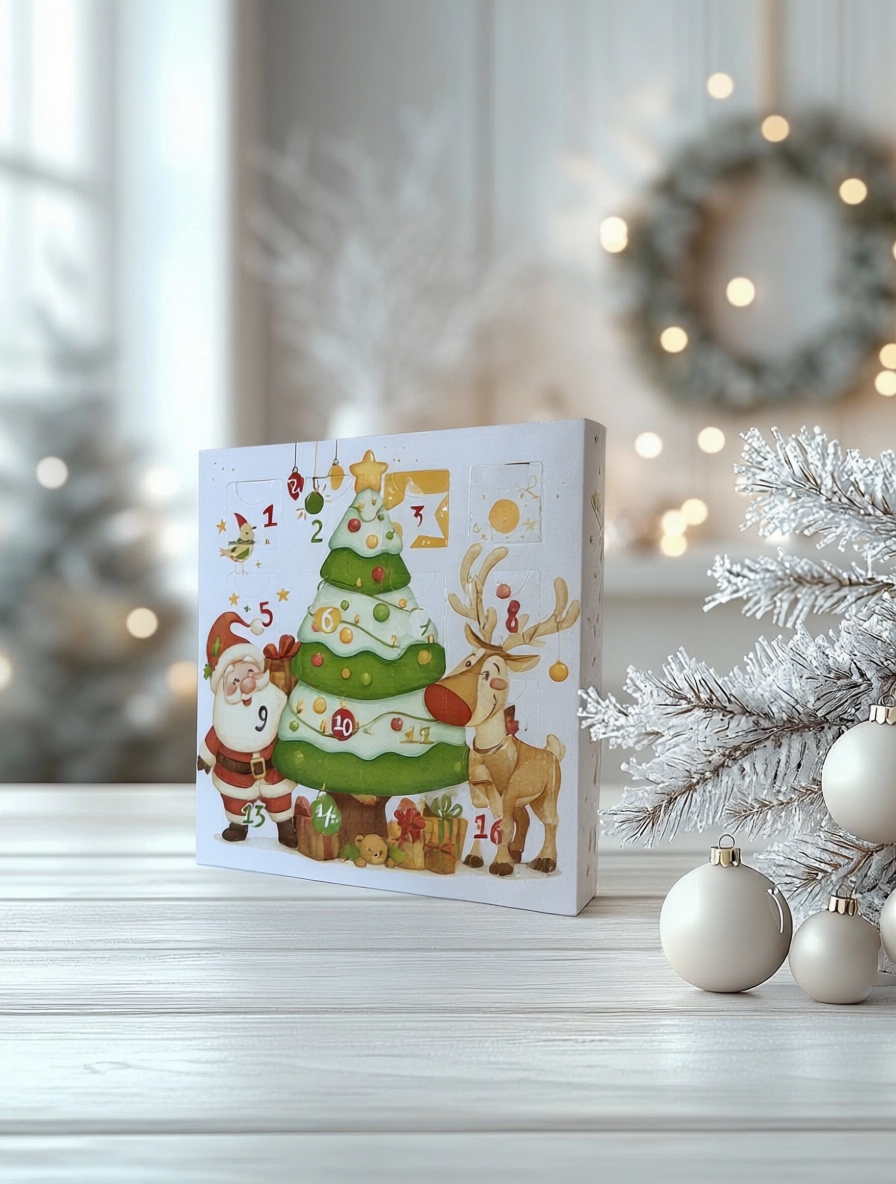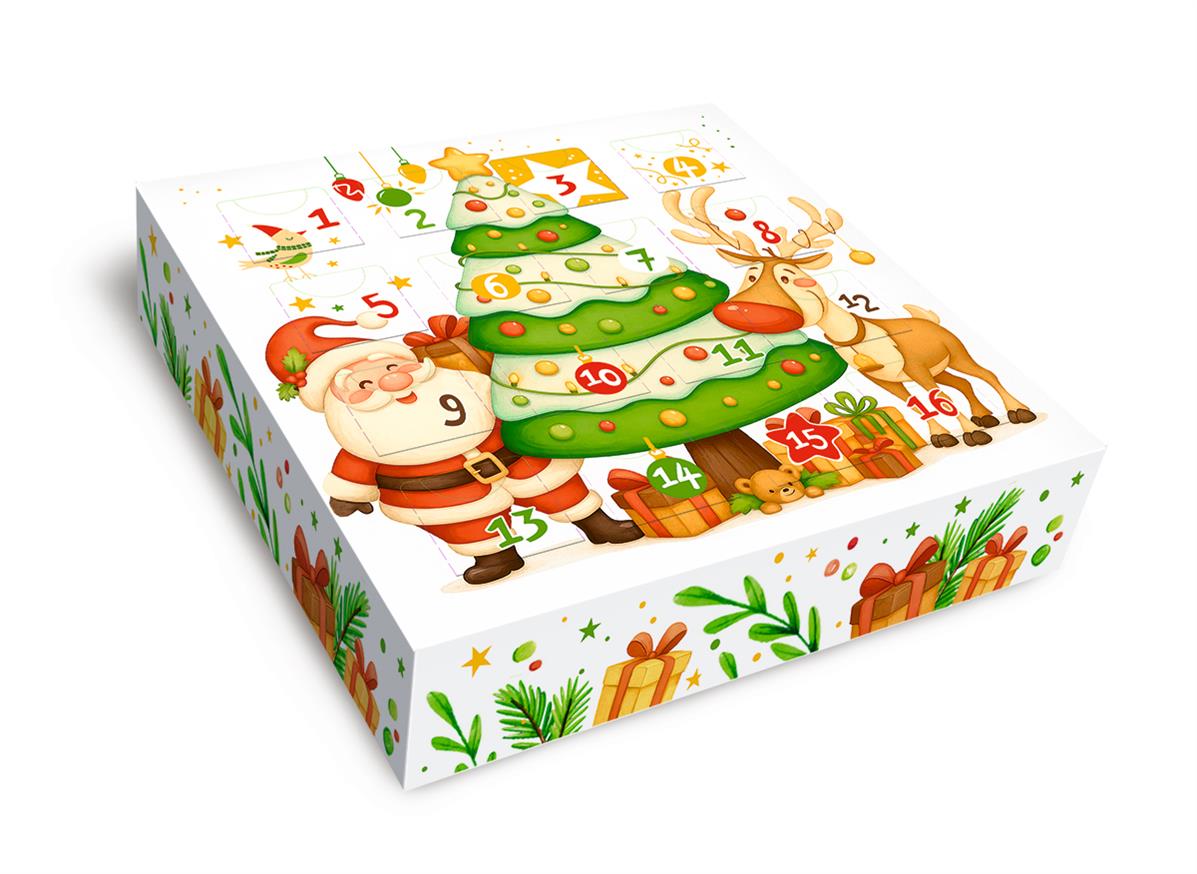 Коробка - в виде АДВЕНТ календаря на 16 конфет с внутренними разделителями с Новогодней тематикой, размер ячеек под конфеты 40х40 мм. Без разделителей подходит для размещения пряников, мармелада и иных сладких презентов. Может быть использована для размещения изделий ручной работы