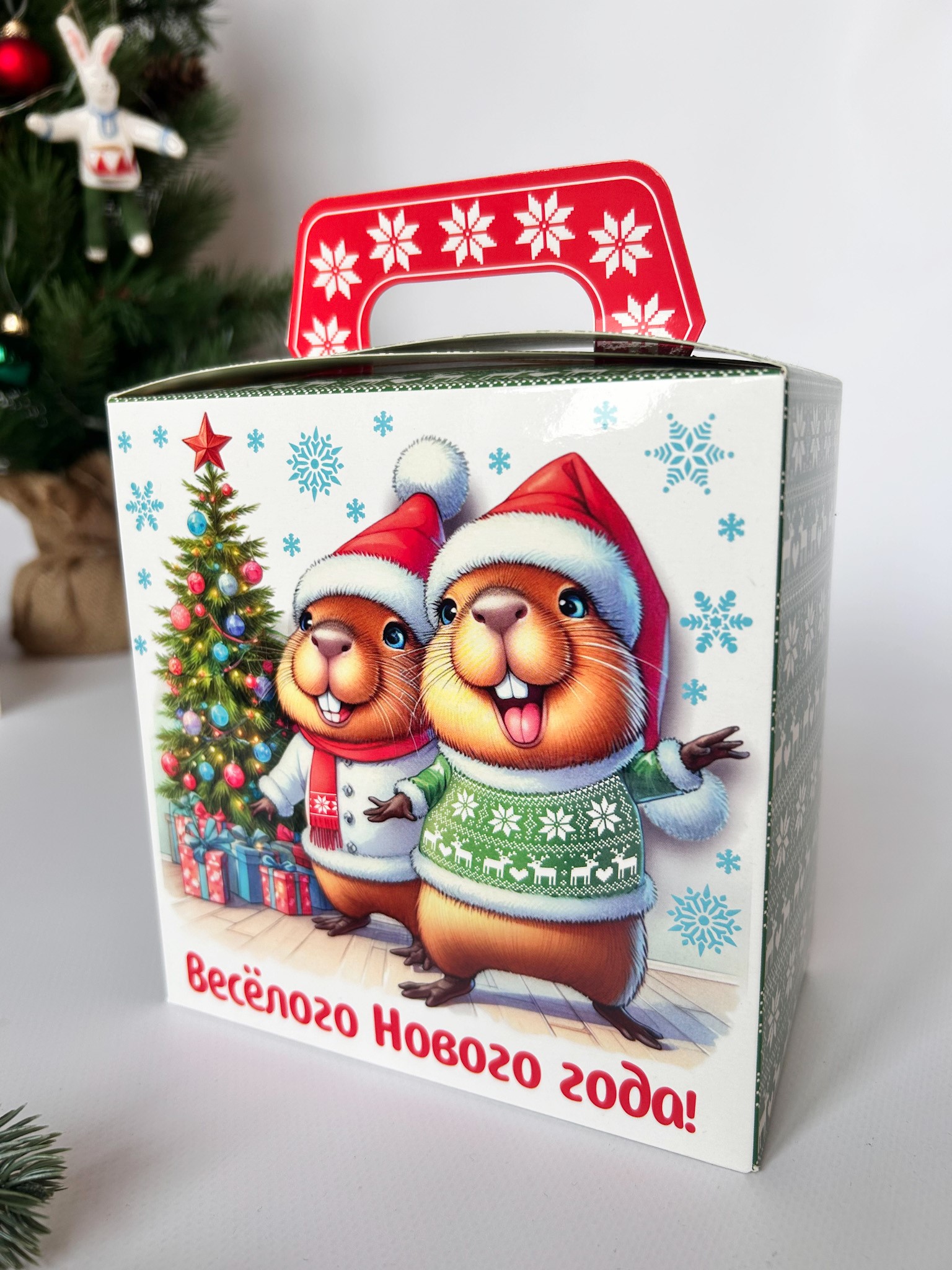 Подарочная коробка новогодней тематики, размеры 14,5х8х15 см., продается упаковками по 5 шт (цена указана за 1 шт), вес подарка 500 гр