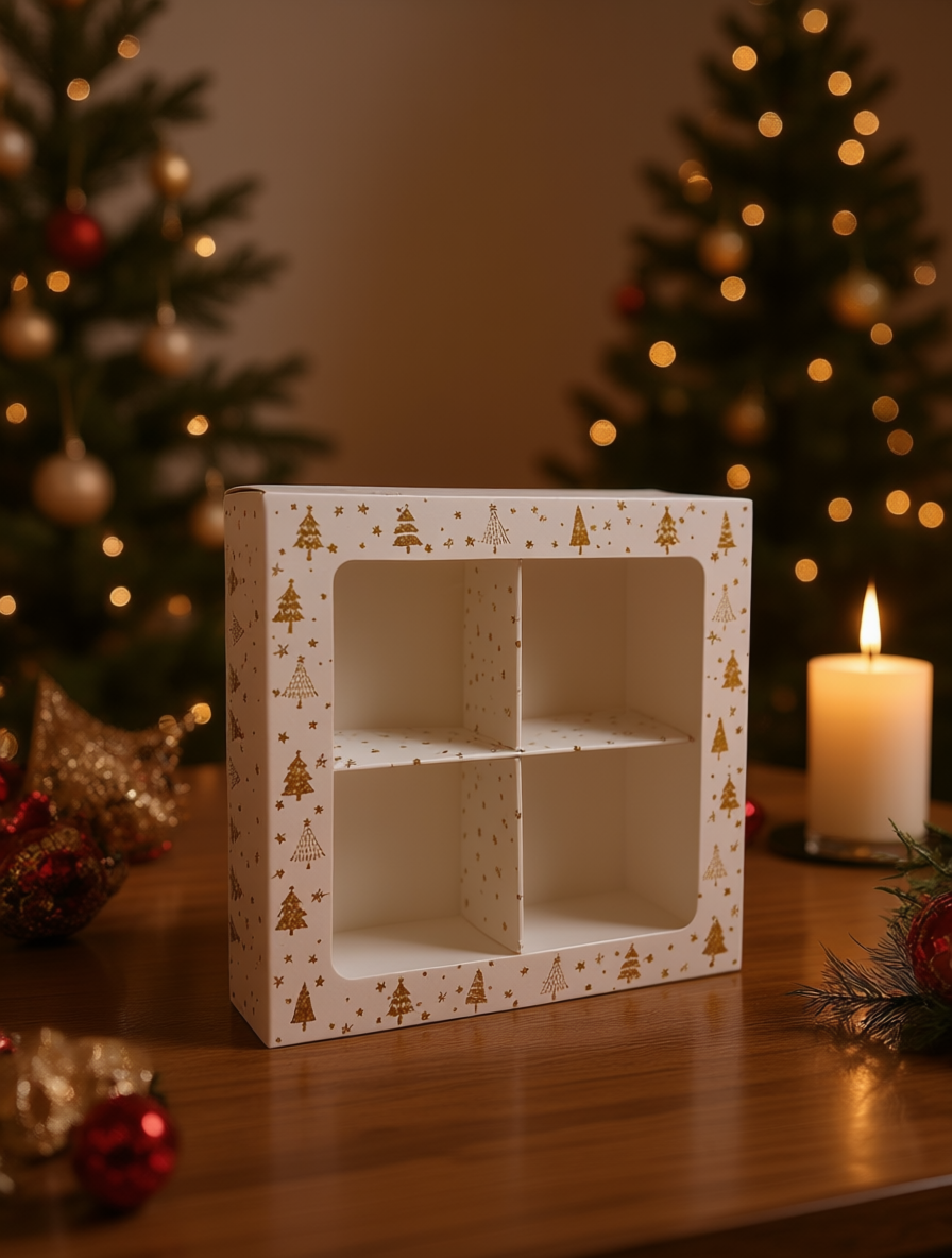 Новогодняя коробка с внутренними тонкими разделителями, подходит для размещения макарун, печенья, пряников, мармелада, пирожных моти и иных сладких презентов. Может быть использована для изделий ручной работы.