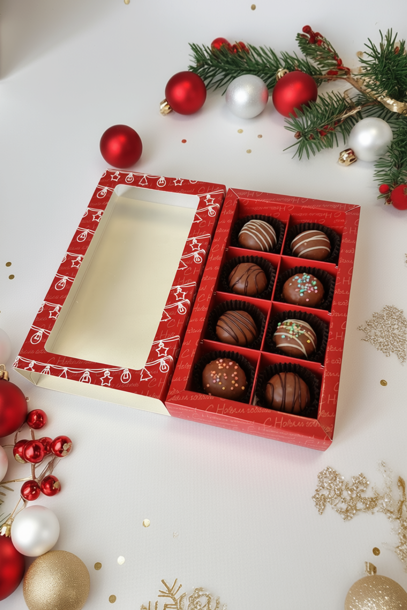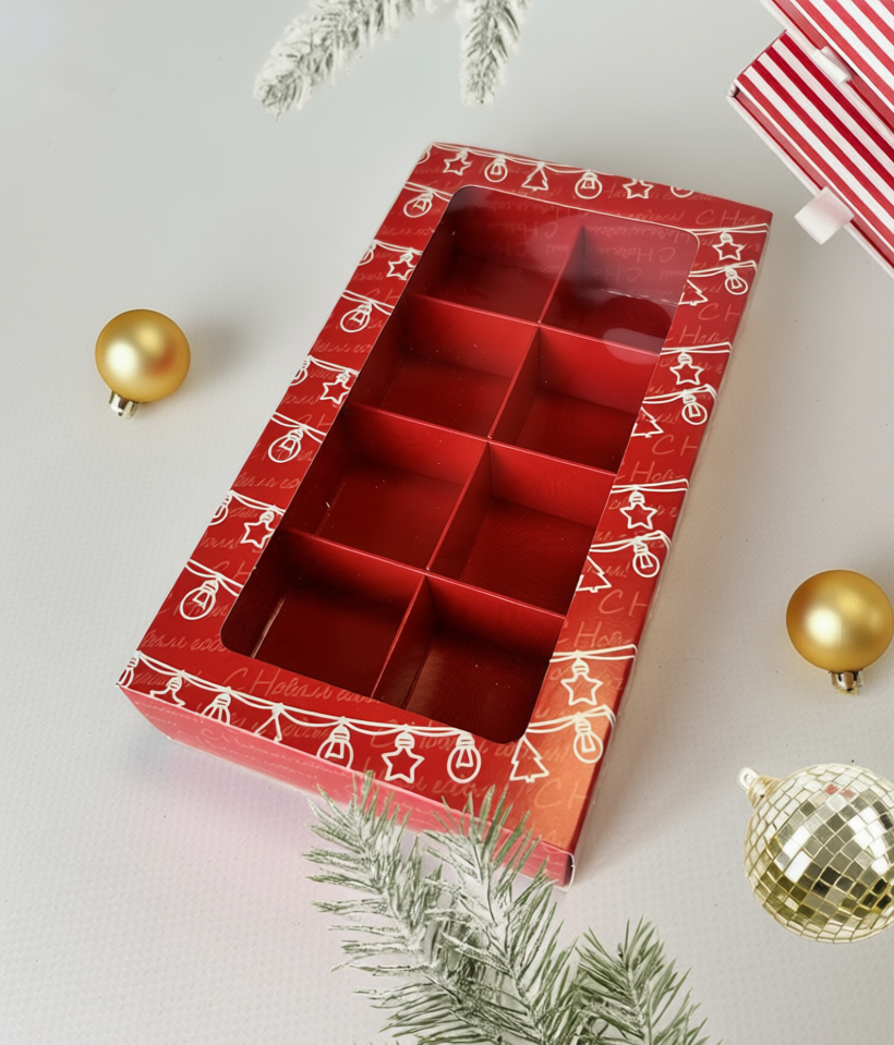 Новогодняя коробка пенал на 8 конфет с внутренними разделителями, размер ячейки: 40х40 мм. Подходит для печенья, мармелада и иных сладостей. Может быть использована для размещения изделий ручной работы