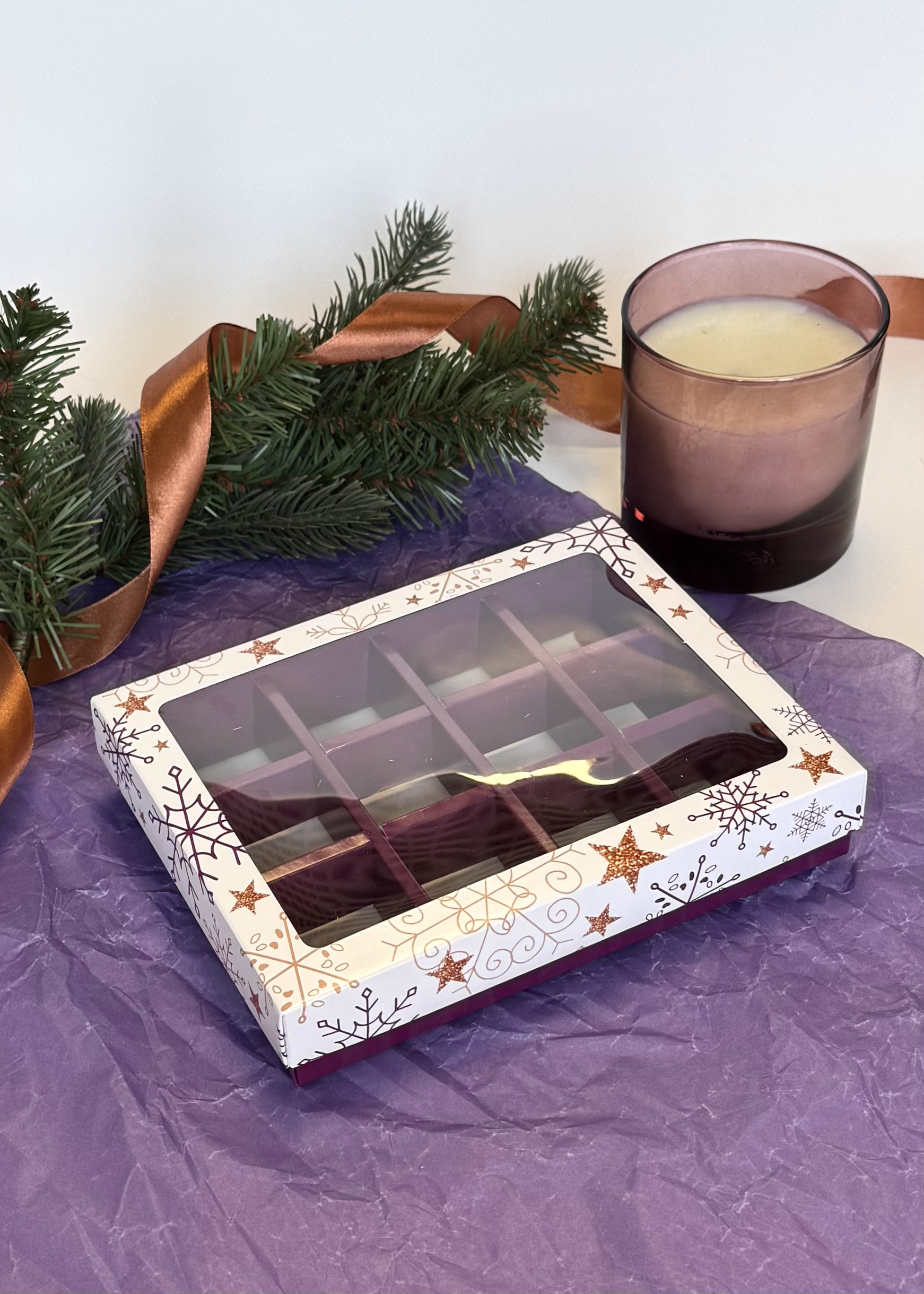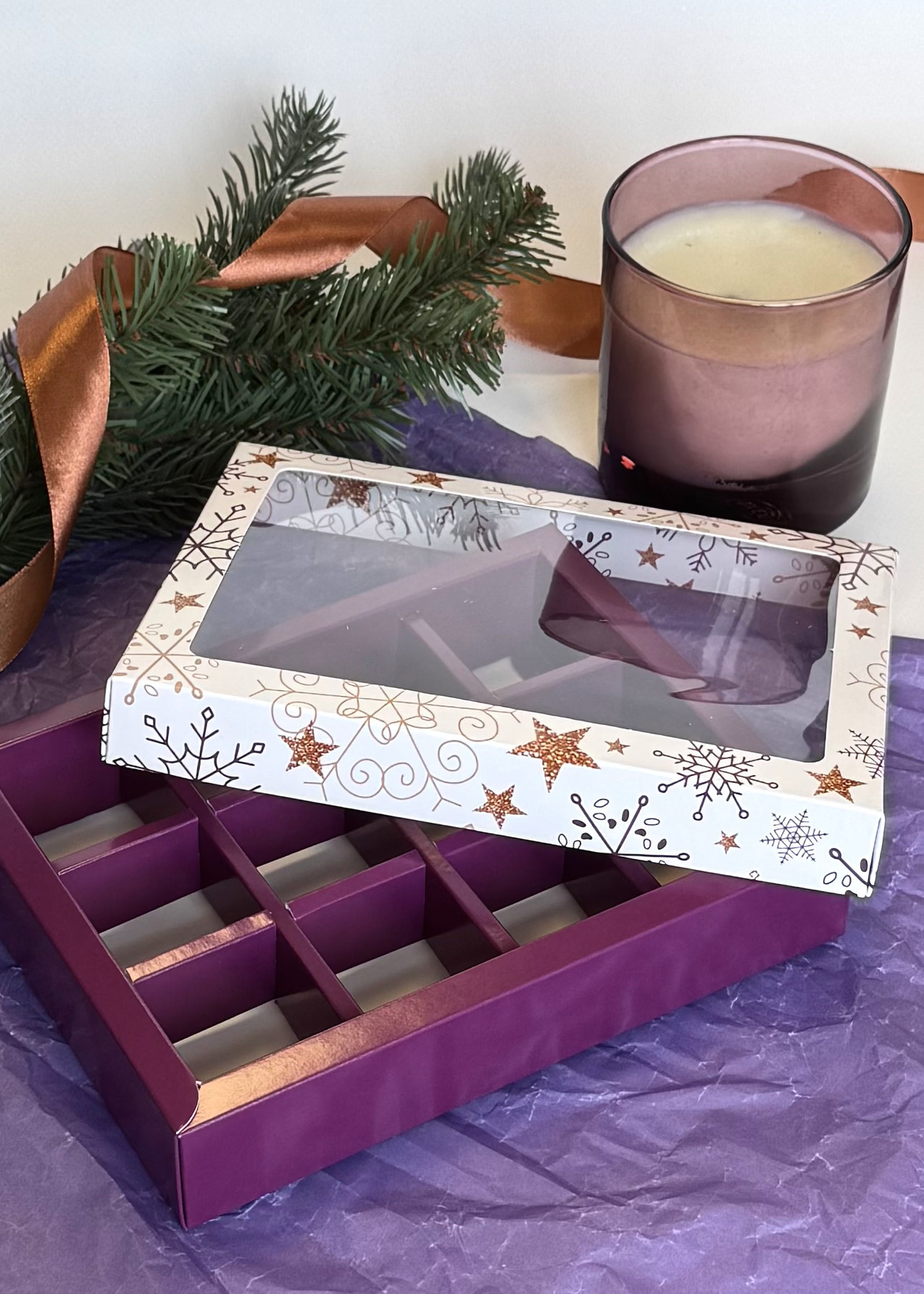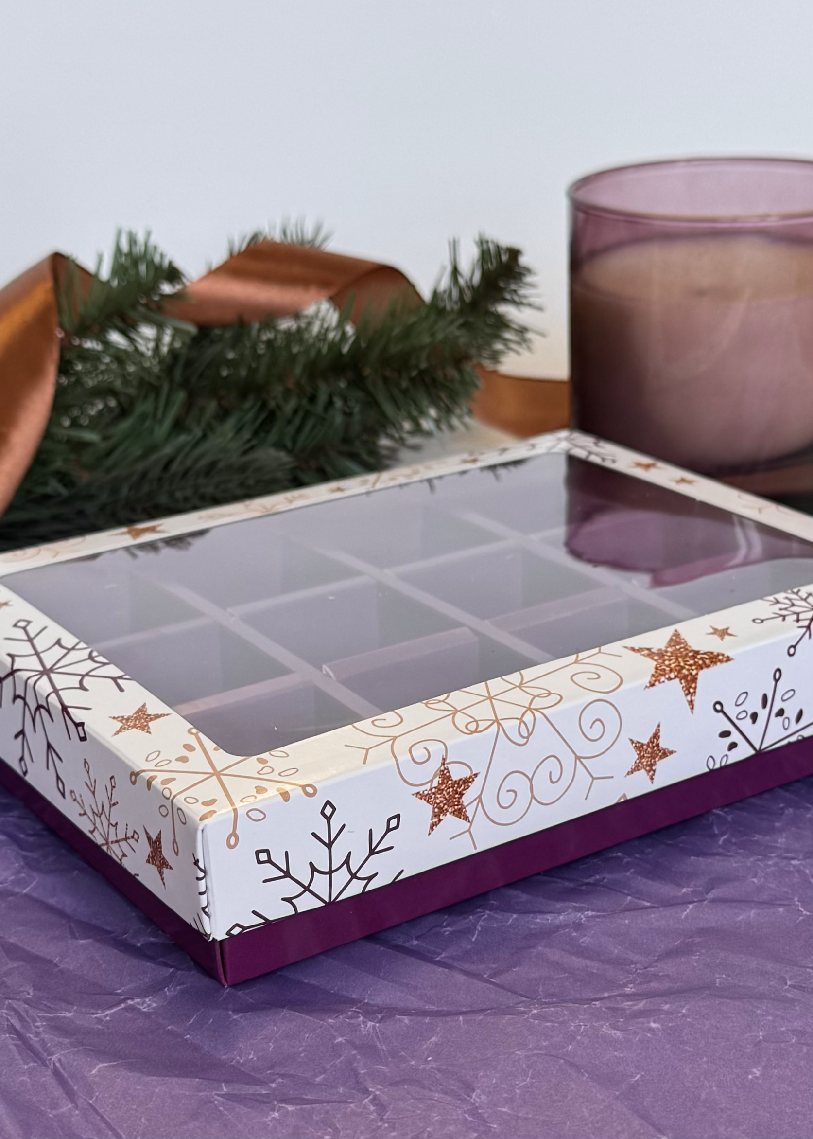 Новогодняя коробка на 12 конфет с внутренними разделителями, размер ячейки 35*35*25ном мм. Подходит для пряников, мармелада и иных сладких презентов. Может быть использована для размещения изделий ручной работы