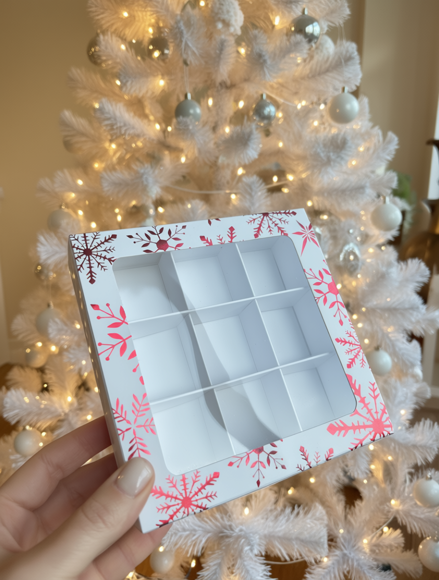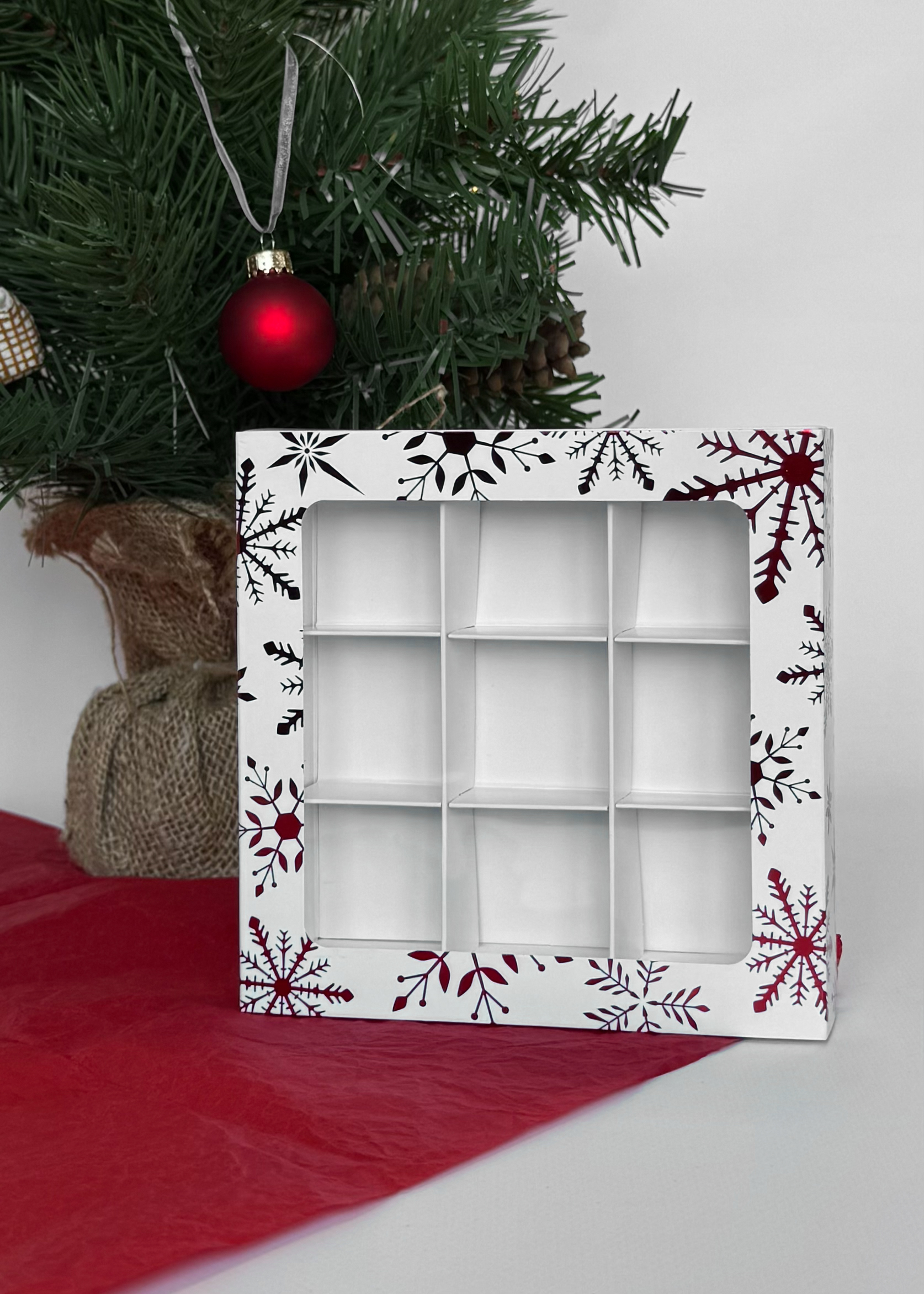 Коробка с обечайкой - коробка пенал на 9 конфет с внутренними разделителями для конфет с Новогодней тематикой, размер ячейки 40х40х25 мм. Без разделителей подходит для размещения пряников, печенья и иных сладких презентов. Может быть использована для размещения изделий ручной работы.