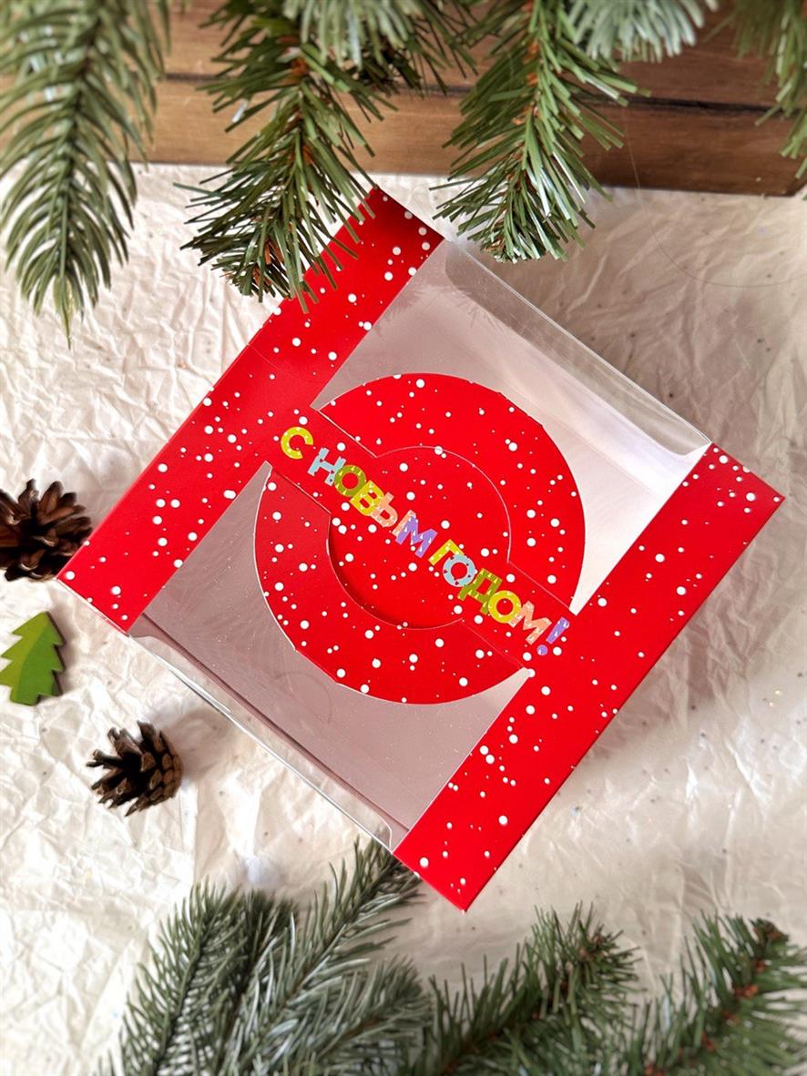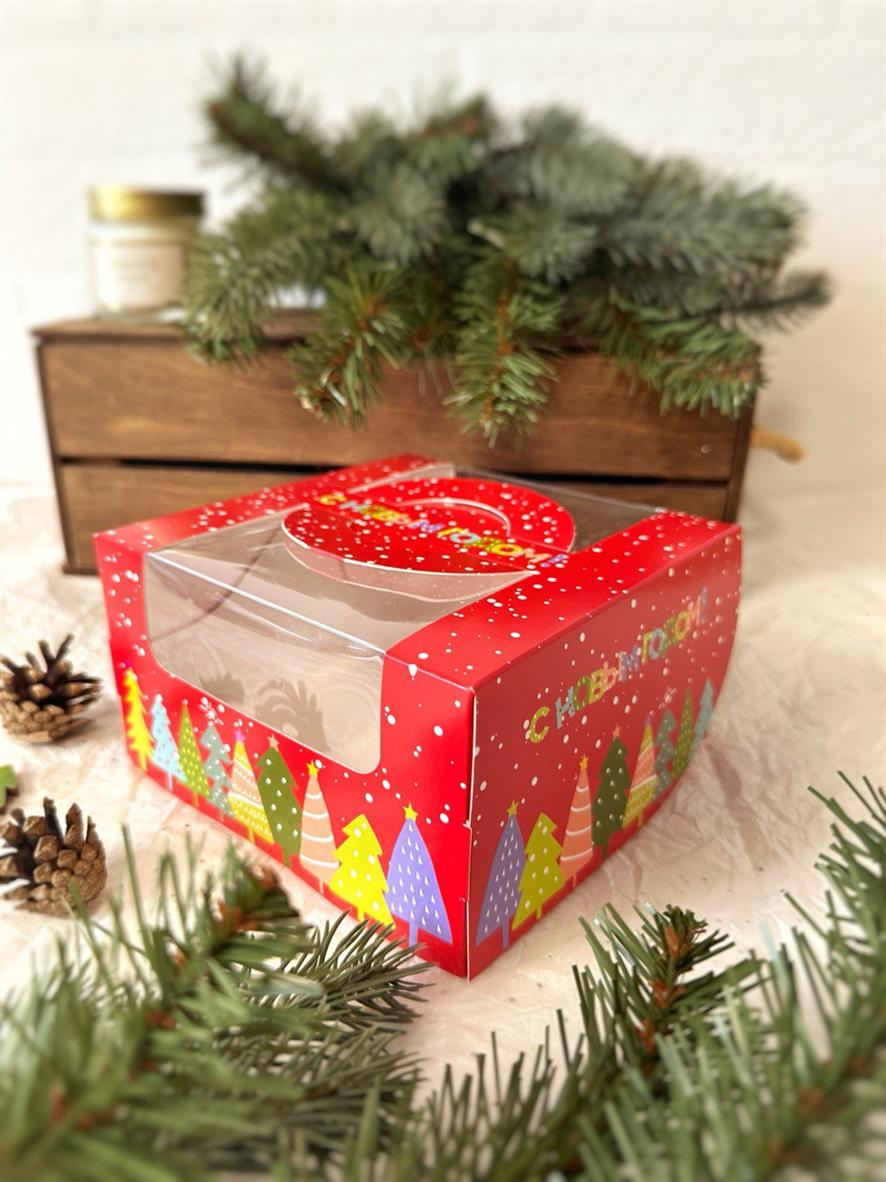 Кондитерская упаковка. Тематическая к Новому году. Подходит для размещения капкейков, пирожных, бенто-тортов и других сладких презентов. Изготовлена из прочного целлюлозного картона.