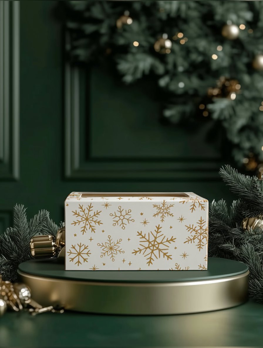 Кондитерская упаковка с новогодним дизайном. Подходит для размещения 2 капкейков, кексов, маффинов, пирожных и иных сладких презентов. Может быть использована для размещения изделий ручной работы, оформления подарков.