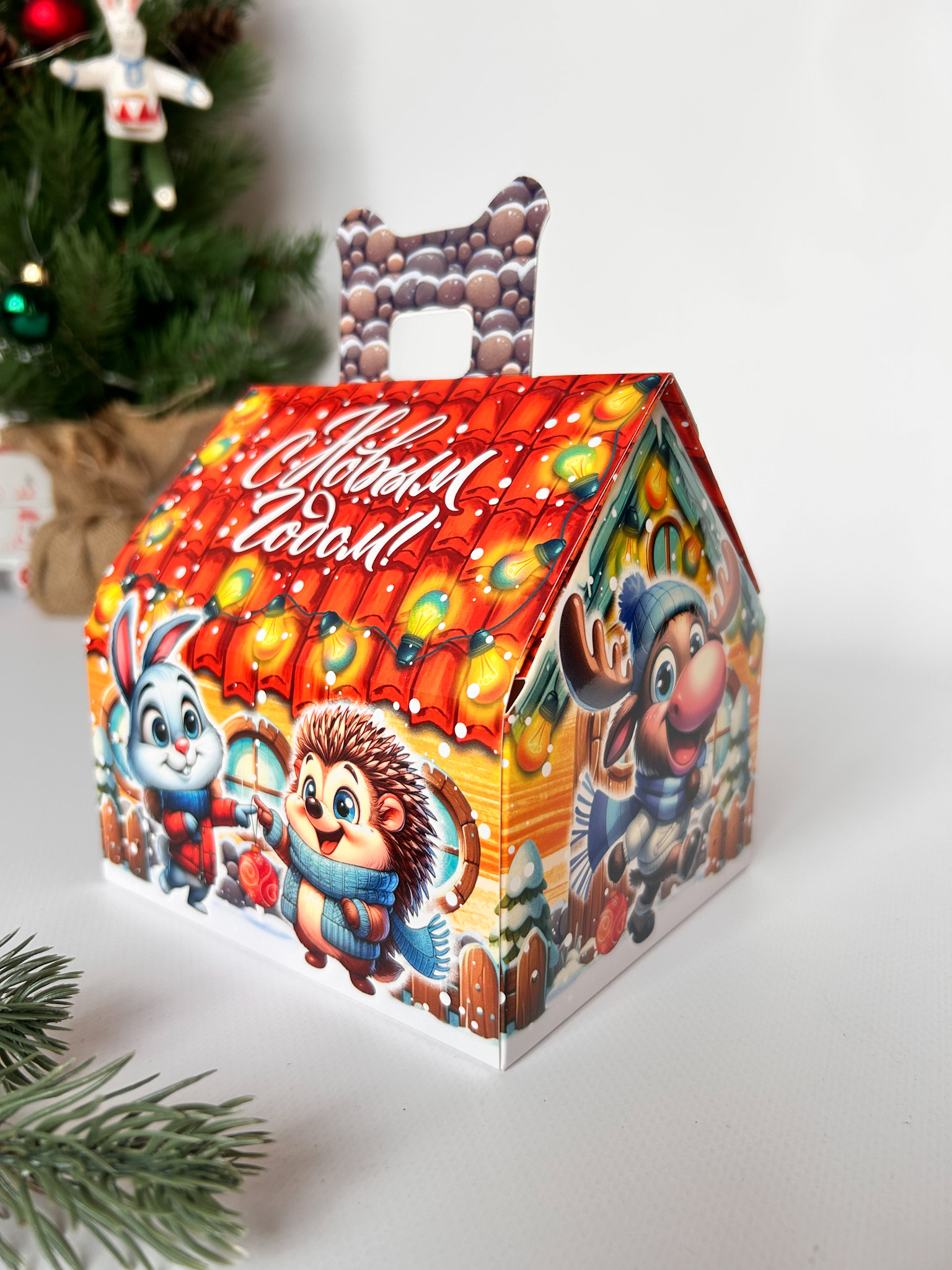 Коробка новогодняя подарочная Ярмарка, 91х70х157 (+30) мм (домик)