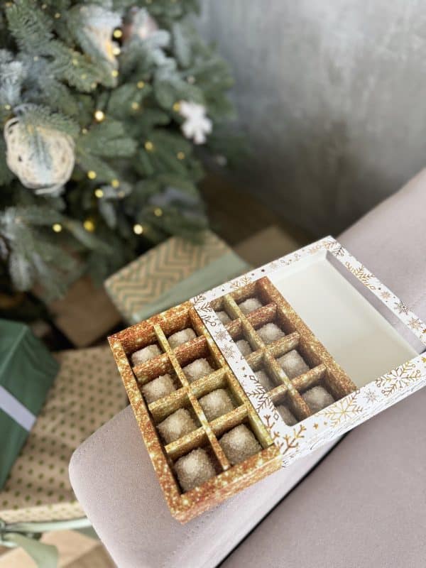 Коробка - в виде АДВЕНТ календаря на 16 конфет с внутренними разделителями с Новогодней тематикой, размер ячеек под конфеты 40х40 мм. Без разделителей подходит для размещения пряников, мармелада и иных сладких презентов. Может быть использована для размещения изделий ручной работы
