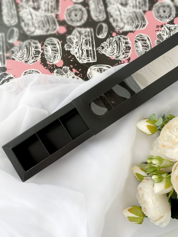 Кондитерская упаковка. Коробка пенал в белом цвете на 3 конфеты, выполнена из высококачественного картона. Размер ячеек 3,5х3,5х33 см. Может быть использована для размещения конфет ручной работы, орехов в шоколаде и иных сладких презентов небольших размеров