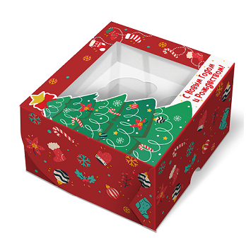 Коробка с окном под 4 капкейка Праздничная ель, 160х160х100