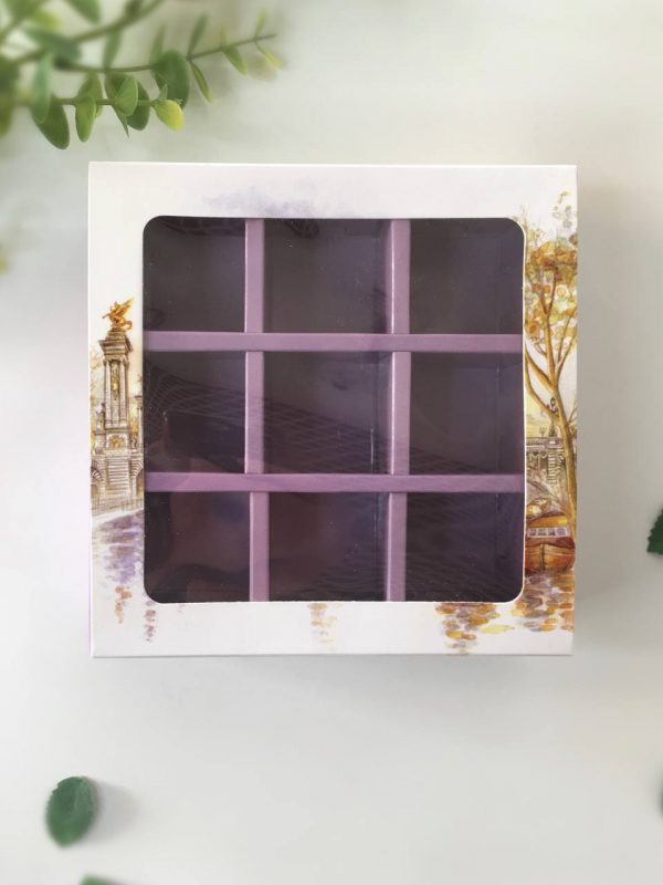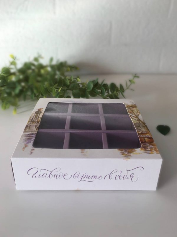 Коробка пенал на 9 конфет с внутренними разделителями, размер ячейки: 35х35х35 мм. Подходит для печенья, мармелада и иных сладостей. Может быть использована для размещения изделий ручной работы